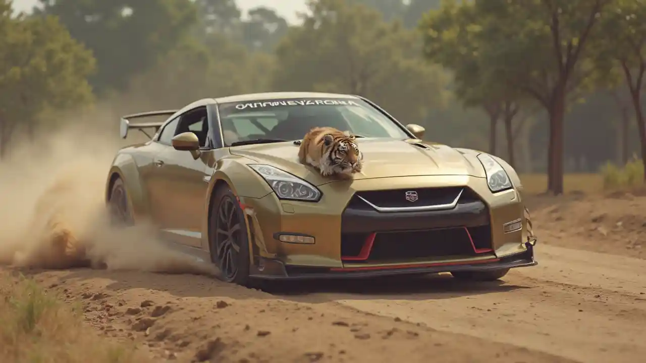 Una corsa di tigri con una Nissan GTR al parco giochi