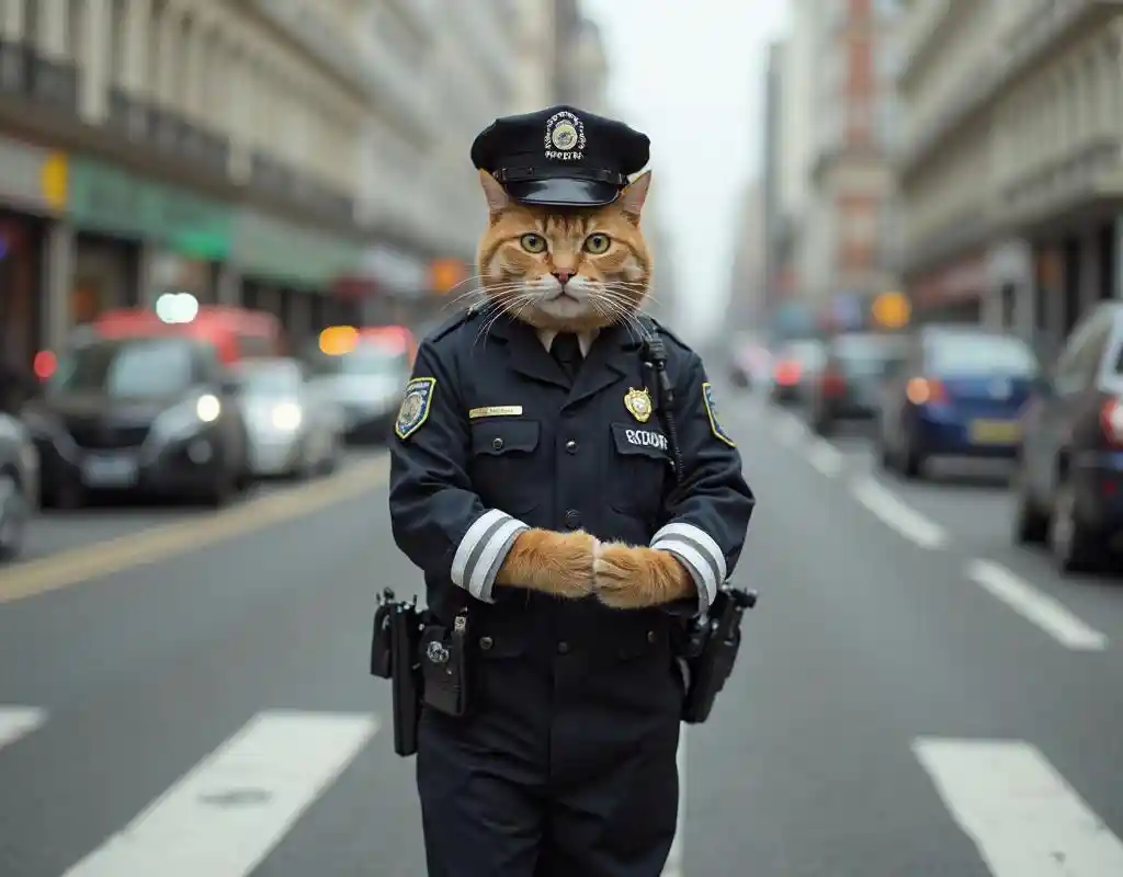 Un gatto in costume di guardia sta organizzando il traffico.