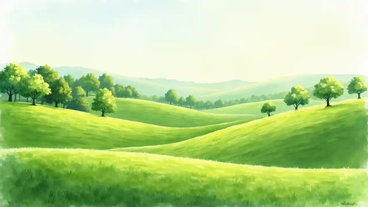 Colline tortuose con una fila di alberi: Immaginate un paesaggio sereno con colline ricoperte di erba viva, che si estendono nel lontano. Un fila di alberi si allineano all'orizzonte, i loro tronchi scuri sullo sfondo più luminoso del cielo. Alcuni alberi hanno le foglie piene, mentre altri stanno appena cominciando a fiorire. La scena dovrebbe avere una sensazione di pace e tranquillità, con una prospettiva morbida e atmosferica per mostrare la profondità mentre le colline svaniscono in lontananza. Usate delicati colori d'acqua per creare le sottili transizioni della luce attraverso i campi