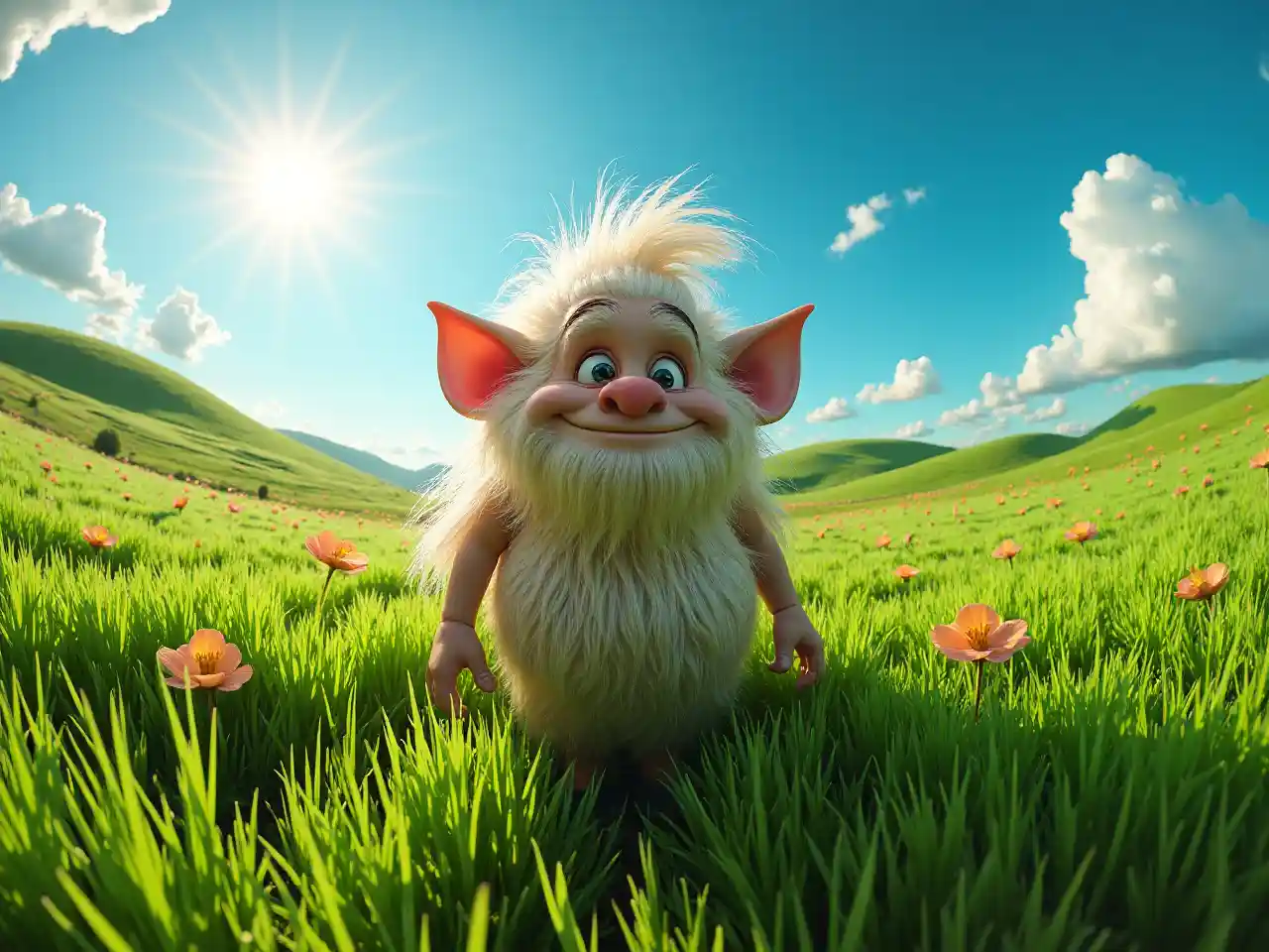 Una foto di ritratto di un troll con un volto arrotondato, catturato attraverso un occhio di pesce, in piedi in mezzo a un prato rigoglioso. Il paesaggio è ondulato da dolci colline sotto un cielo brillante e soleggiato. Colori vivaci esplodono nella scena, mentre l'erba smeraldo oscilla e il cielo azzurro si estende all'infinito, punteggiato da nuvole.