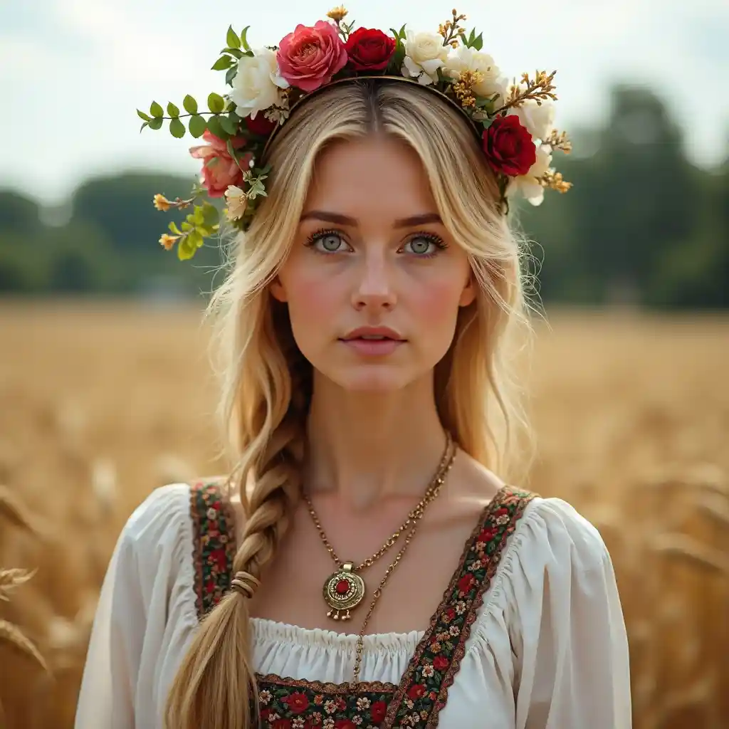 Una bella modella con i capelli lunghi e biondi è vestita in un costume tradizionale ucraino. Indossa gioielli tradizionali ucraini al collo, con ricamo e una corona di fiori sulla testa. Lei è in un campo di grano.Foto. Ritratto