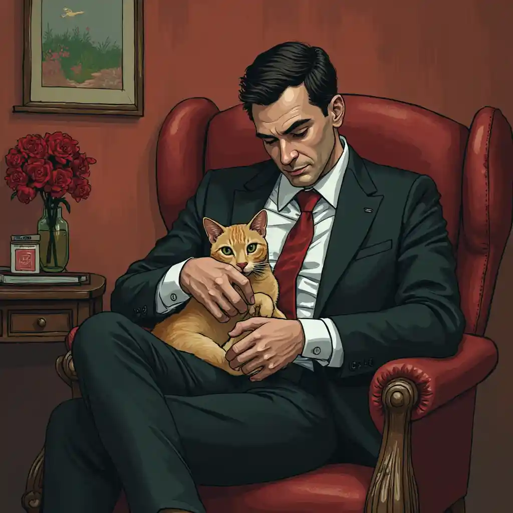 MaverickUn vampiro russo del KGB, che finge di essere un cittadino umano, siede su una sedia e accarezza il suo amato gatto, di Gemma Correll