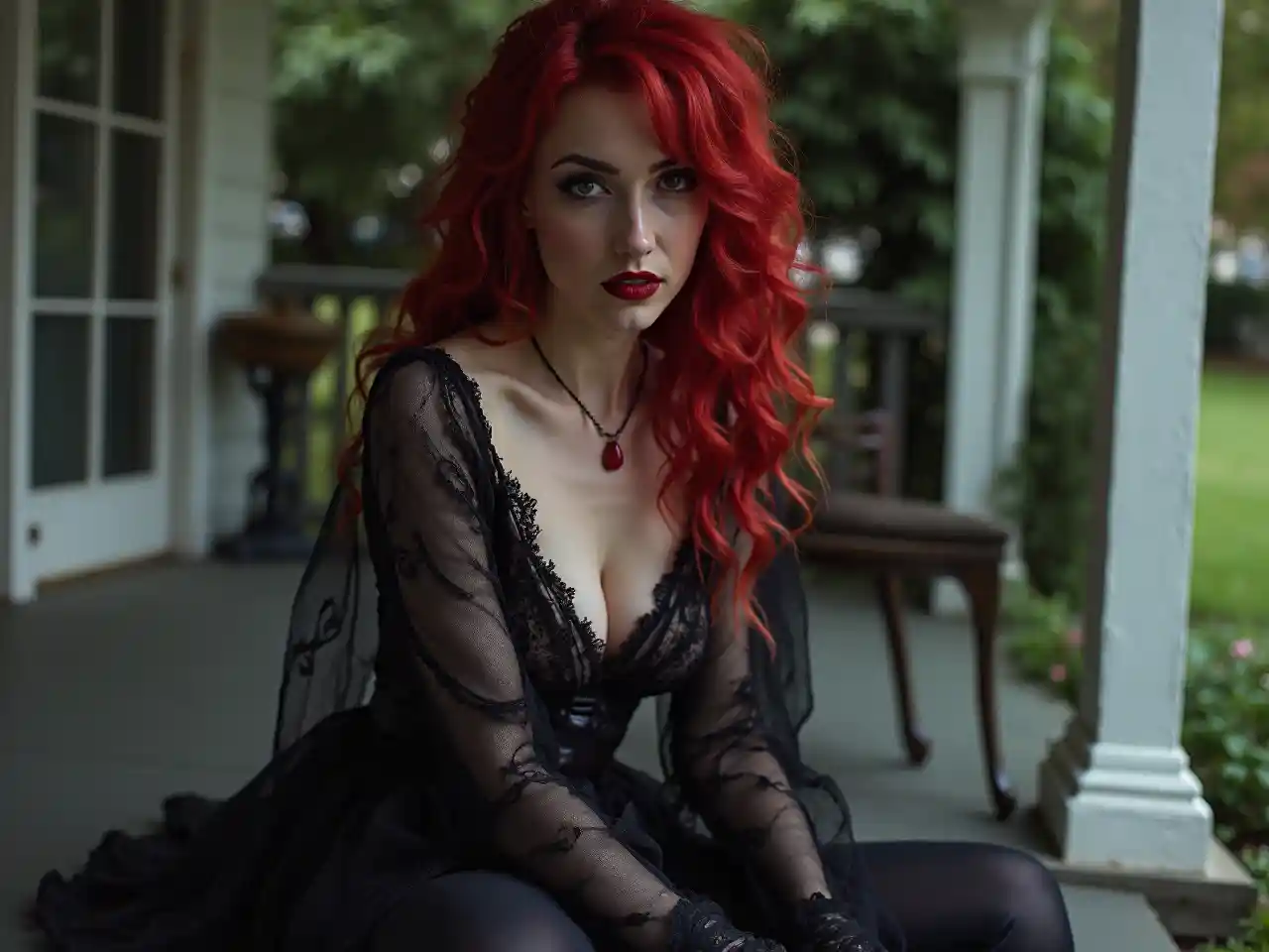 Un vampiro erotico con la testa rossa e pizzo nero seduto su un portico meridionale