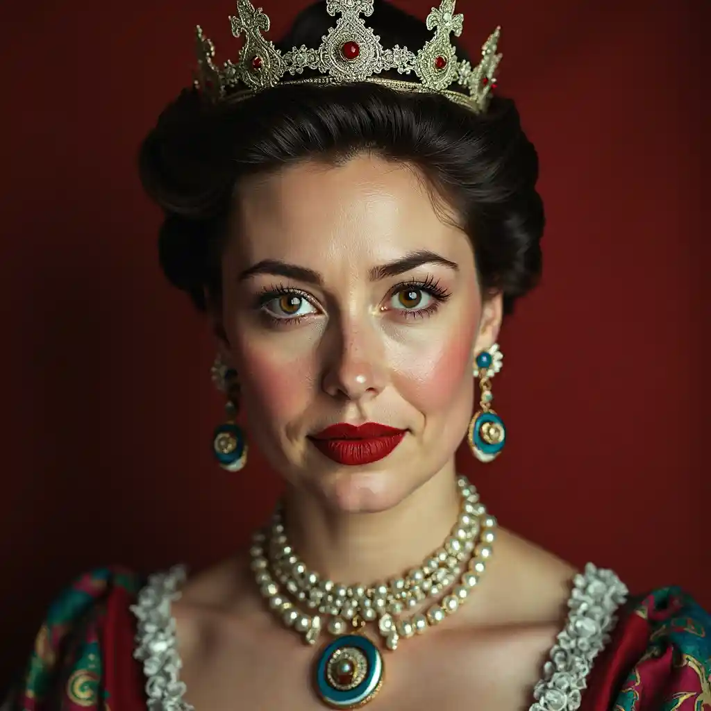 Regina Vittoria, regia di Wes Anderson, stile Wes Anderson, bizzarro, colori saturi, contrasto, foto in studio, foto professionale, colori ricchi, immagine dettagliata, volto dettagliato