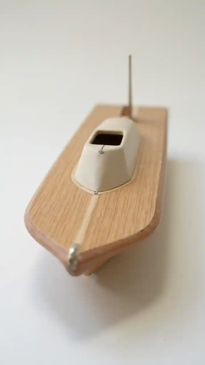 NathanUna giocattolina grassa degli anni '50 per una barca da corsa progettata da Dieter Rams. Semplicità minimalista post-modernista. - La copertina di quercia e la plastica stampata. Tutto a vista.