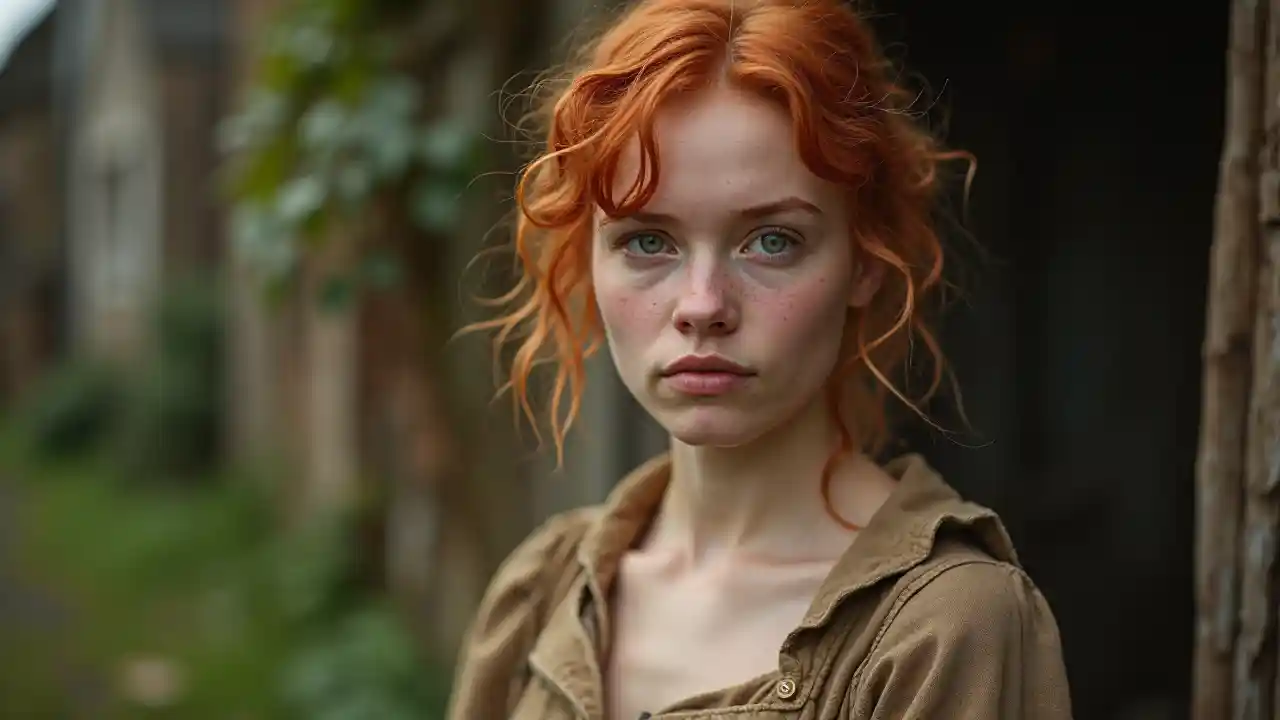 donna sui venti con i capelli rossi, tipica del periodo dei quaranta. abito modesto. sfondo cottage. occhi verdi chiari a forma di mandorla