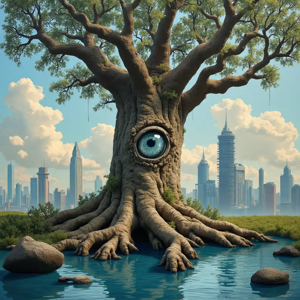 Un occhio incastonato nella corteccia di un antico albero, le sue radici intrecciate con l'acqua riflettente, surreale e fluida in natura, rispecchiando lo stile unico di Brian Despain. La scena è una sinfonia di vernice che gocciola, sfocando i confini tra realtà e fantasia. Paesaggi estesi si estendono all'orizzonte, passando senza intoppi in scene urbane altamente dettagliate dove le strutture sfidano la gravità in un cenno ai mondi immaginati da Mars Ravelo. L'ambientazione è infusa con le ricche trame di Mati Klarwein, creando un arazzo di elementi naturali intrecciati e paesaggi urbani futuristi. Questa composizione visionaria invita gli spettatori a un paesaggio onirico dove l'occhio dell'albero sorveglia un delicato equilibrio tra la natura incontaminata e una metropoli surreale.