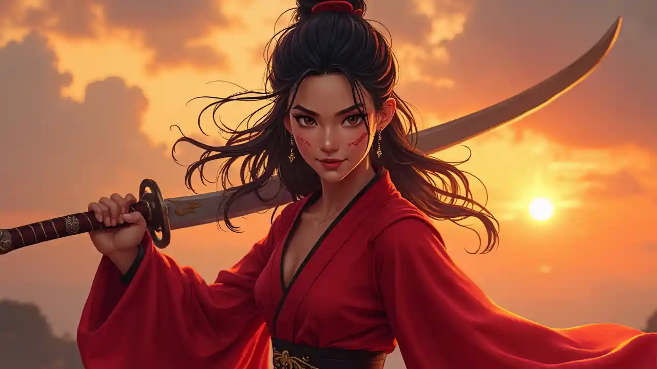 Un ritratto digitale di una donna guerriera impavida simile a Mulan, che regge una spada con un sorriso feroce e determinato. Indossa un vestito rosso vibrante, che cattura un atteggiamento forte e coraggioso, che emana una presenza potente. Lo stile d'arte è influenzato da Martin Ansin, mostrando una dinamica e intensa focalizzazione. I suoi occhi penetranti e i capelli che scorrono migliorano la sua vista frontale, tutto in ultra HD, risoluzione 16k, sottolineando dettagli sorprendenti come elementi di armatura intricatamente progettati e sottile vernice da guerra sulla guancia. Lo sfondo riecheggia i colori dell'alba imminente, evidenziando la sua sagoma in un rapporto di 9:16, creando un'atmosfera di serenità e di forza.