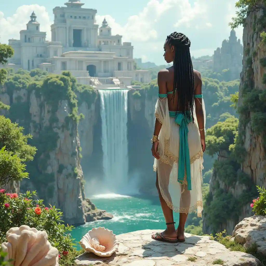 Un'antica città con due cascate Una statua di pietra nera di Atlas si trova in cima a un palazzo di pietra bianca e circondata da verdi giardini con fiori colorati Una giovane principessa guerriera nera si trova su una pietra di marmo che domina la scena È vestita come un antico mercante d'estate I suoi vestiti sono trasparente e puro bianco e hanno ricamo d'oro I suoi lunghi capelli neri sono intrecciati con un nastro d'oro e e e e e e e e e e e e e e e e e e e e e e e e e e e e e e e e e e e e e e e e e e e e e e e e e e e