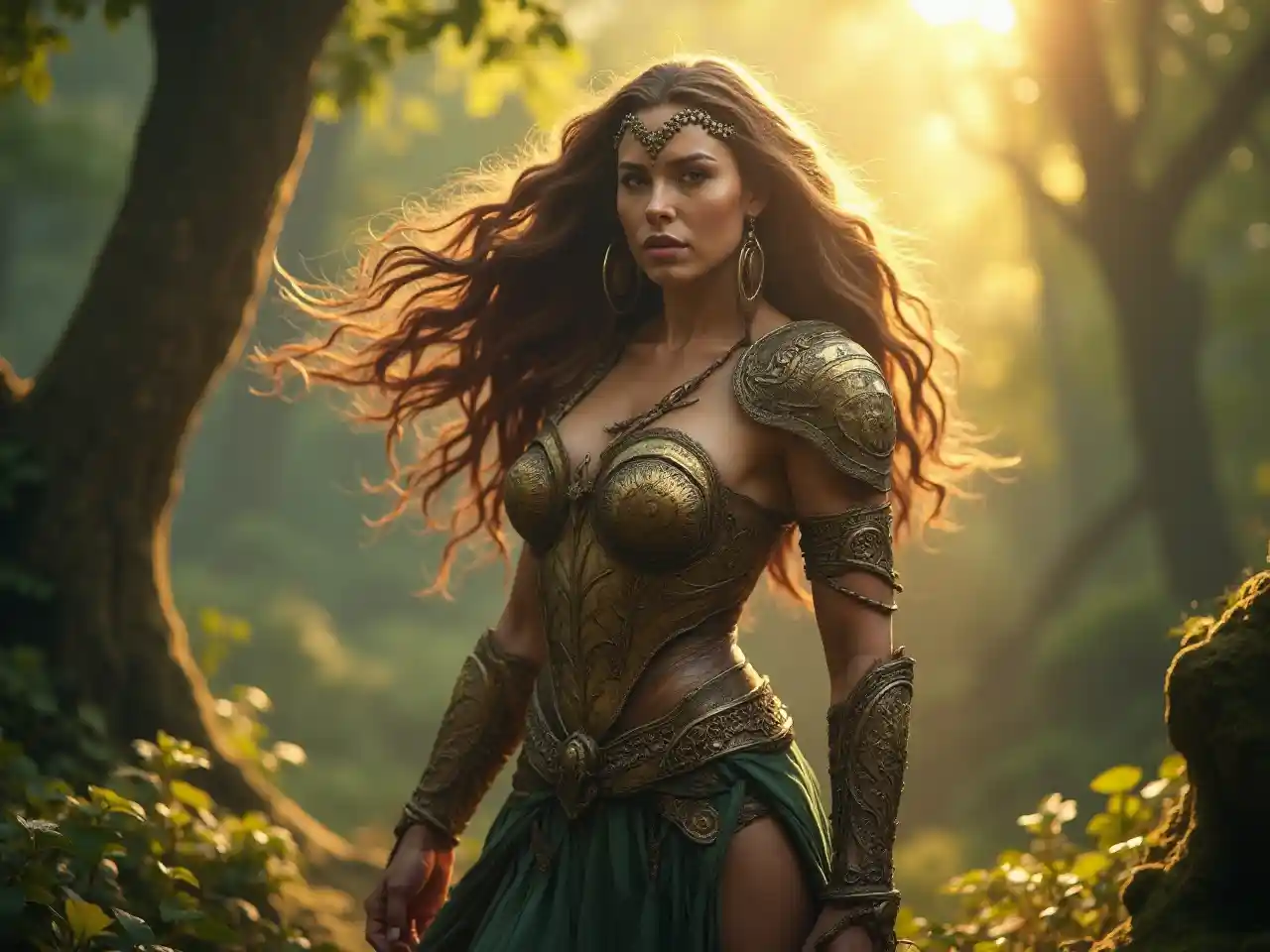 Amazon warrior queen, hyper-realistic, exquisitely detailed, enchanted forest lighting, vibrant hdr, atmospheric depth, ethereal mist, dynamic pose, fierce expression, intricate armor design, mythical landscape, golden hour glow, tall and powerful presence, enchanting natural elements, mystic aura, otherworldly ambiance.