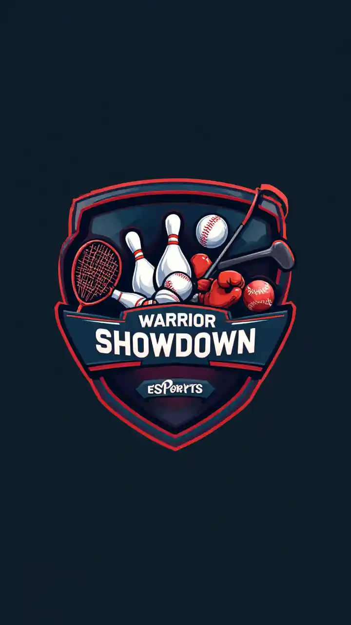 ChloeUn logo a forma di scudo con attrezzature sportive (raccetta da tennis, baseball, bowling, guantoni da boxe, mazzo da golf) sopra il testo "WARRIOR SHOWDOWN eSports".
