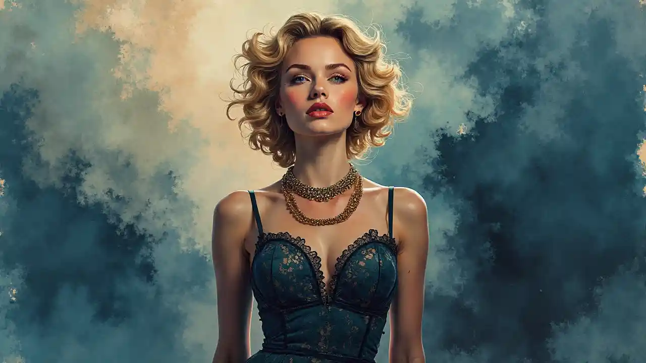 STILLO: "Una fusione di acquarello con spruzzo di whisky + il surrealismo di James Jean + gli effetti atmosferici di Ash Thor, dove le texture di spruzzo di inchiostro si fondono con gradi fumosi e campi di colore blu. Lo stile utilizza illuminazione a contrasto chiaroscuro, sovrapposizioni di texture di gouache e pennellate espressive con linee di inchiostro. Sono presenti toni terrestri attenuati accentuati da evidenze argentee e tocchi di cremisi, effetti luminosi a fuoco morbido e schizzi di inchiostro organico che creano tecniche di pittura. L'acquerello sanguinante, le transizioni fumose e i metodi di pittura a texture esaltano i soggetti attraverso il movimento fluido artistico e la profondità dell'atmosfera". Donna bionda degli anni '50, contatto visivo diretto e espressione, in piedi, tutto il corpo