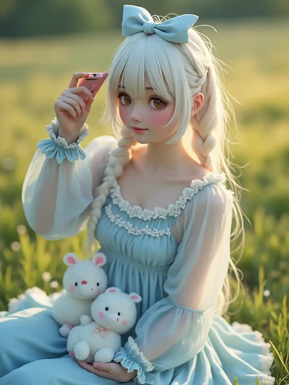 Una ragazza con i capelli bianchi, capelli bianchi, capelli lunghi, con trecce gemelle, occhi dorati, capelli lasciati alle. Lei è seduta sull'erba in un ambiente esterno, prendendo un selfie specchio. Indossa un vestito blu morbido in stile vintage ornato di ricci bianchi e dettagli a forma di cuore sul petto e. Le maniche sono lunghe e trasparenti con manette a riccio, creando un'estetica leggera e sognante. Il suo look è accessoriato da un grande arco a nastro sulla testa. I giocattoli di peluche, tra cui un coniglio bianco e un alpaca peloso, vengono posti sulle sue ginocchia, aggiungendo un'atmosfera giocosa e carina. Usa una mano per tenere il telefono mentre l'altra protegge gli occhi dal sole, facendo nascondere parzialmente la sua espressione ma emettendo una vibrazione delicata, rilassato, sorriso capolavoro, alta qualità, luce morbida, texture naturali della pelle, illuminazione ambiente calda e accogliente, ombra realistica, ombre morbide, gradi forti, sensazione cinematografica, aspetto crudo ma naturale