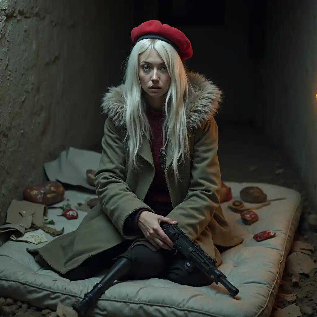 Una donna con i capelli lunghi e bianchi. Indossava un grande cappotto con la pelliccia intorno al collo. Con un berretto rosso in testa, seduta su un materasso sul pavimento di un bunker, un po' di cartone, e cibo e un'arma da fuoco nelle sue mani, e un morso al collo.