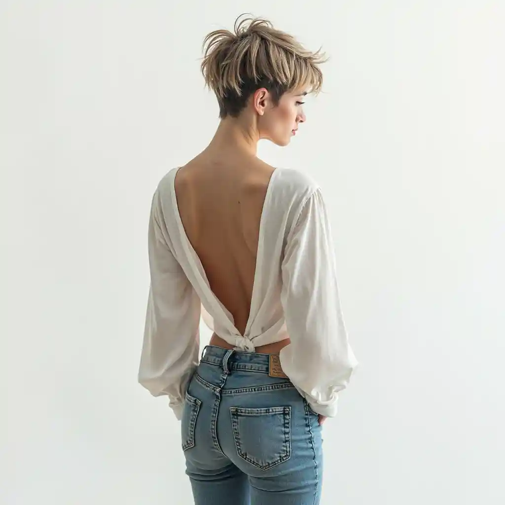 più bianco del bianco è la biancheria di una bella silhouette femminile aperta da dietro, in una camicetta di raso e boho jeans. taglio di capelli da fantoccio, figura di un orologio, acquarello bianco a più strati su carta bagnata sfumato grigio chiaroscuro sfocato... performance erotiche stile Stive Hanks&Vincente Romero Redondo seducente mezza volta vista in retrospettiva alta risoluzione