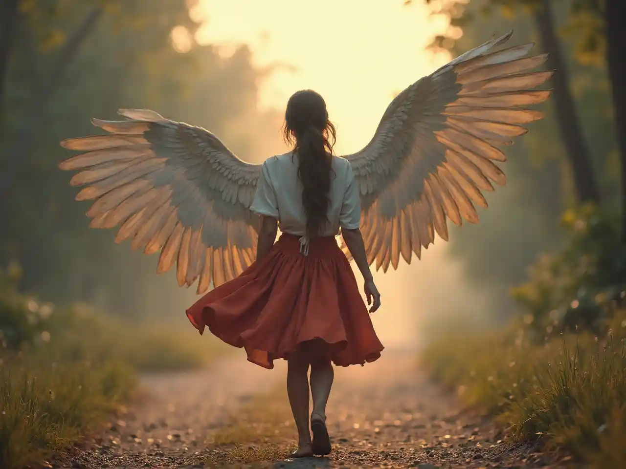 Una camminata serena con le ali e la gonna che fluttua