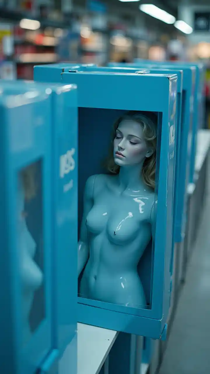 all'interno del grande magazzino, una donna • come un manichino • bellissima faccia addormentata. lei è all'interno di una scatola di imballaggio blu con coperchio di plastica dura. la scatola era in piedi, posto su uno scaffale, per noleggio, ci sono un sacco di stessa scatola in fila, futuristico, mondo cibernetico, fotografia, 8K.