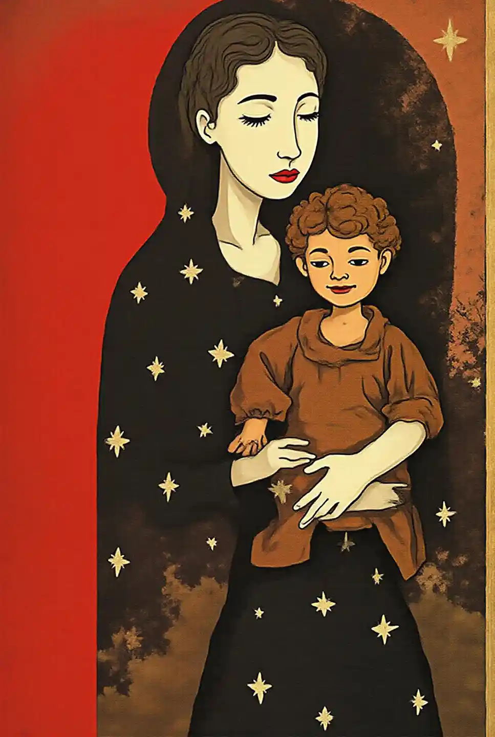 LaylaStile Bauhaus, madre vergine, bambino, stile Warhol, stella da fuoco, nero, rosso, oro a punta, disegno geometrico, arte minima, arte pop, arte moderna, collage, YFG-Bauhaus