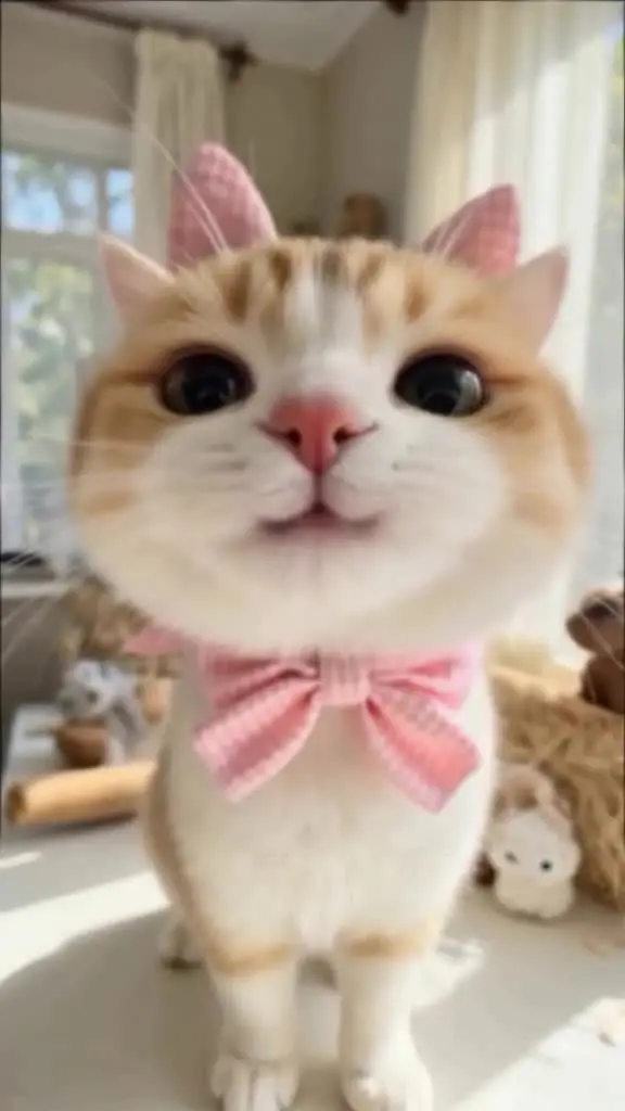 Una deliziosa scena si svolge mentre un adorable gatto, dai grandi occhi espressivi e un affascinante papillon rosa, cattura con le sue buffone. Appollaiata su una superficie bianca incontaminata, la confortevole stanza che la circonda è ornata da una leggera luce e da una serie di oggetti decorativi che accrescono l'atmosfera calda. In una meravigliosa dimostrazione di magia dell'IA, questo felino peloso sembra prendere vita, imitando senza sforzo canzoni allegre e frasi gioc. La sua piccola bocca si muove in perfetta sincronia con i soffi di un'altra, lasciando gli spettatori a posto dalle espressioni perfettamente sincronizzate. Con ogni sguardo adorabile e capriccioso inclinazione della testa, questo gatto carismatico porta una scintilla di gioia e risate, mostrando l'incredibile capacità della tecnologia di rendere i nostri amici più luminosi. Guardate come il gatto intelligente ruba i cuori e crea sorrisi, ricordandoci quanto possa essere divertente quando gli animali si uniscono al divertimento!