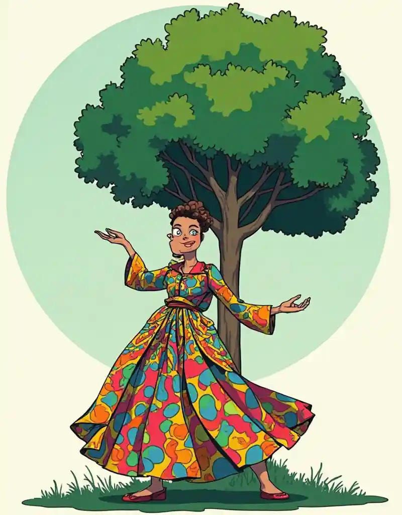 図解。. 鮮やかな色の抽象的なパターンの服を着た女性は、美しい手の動きが独特の魅力的な視覚効果を生み出します。. 大きな緑のtre