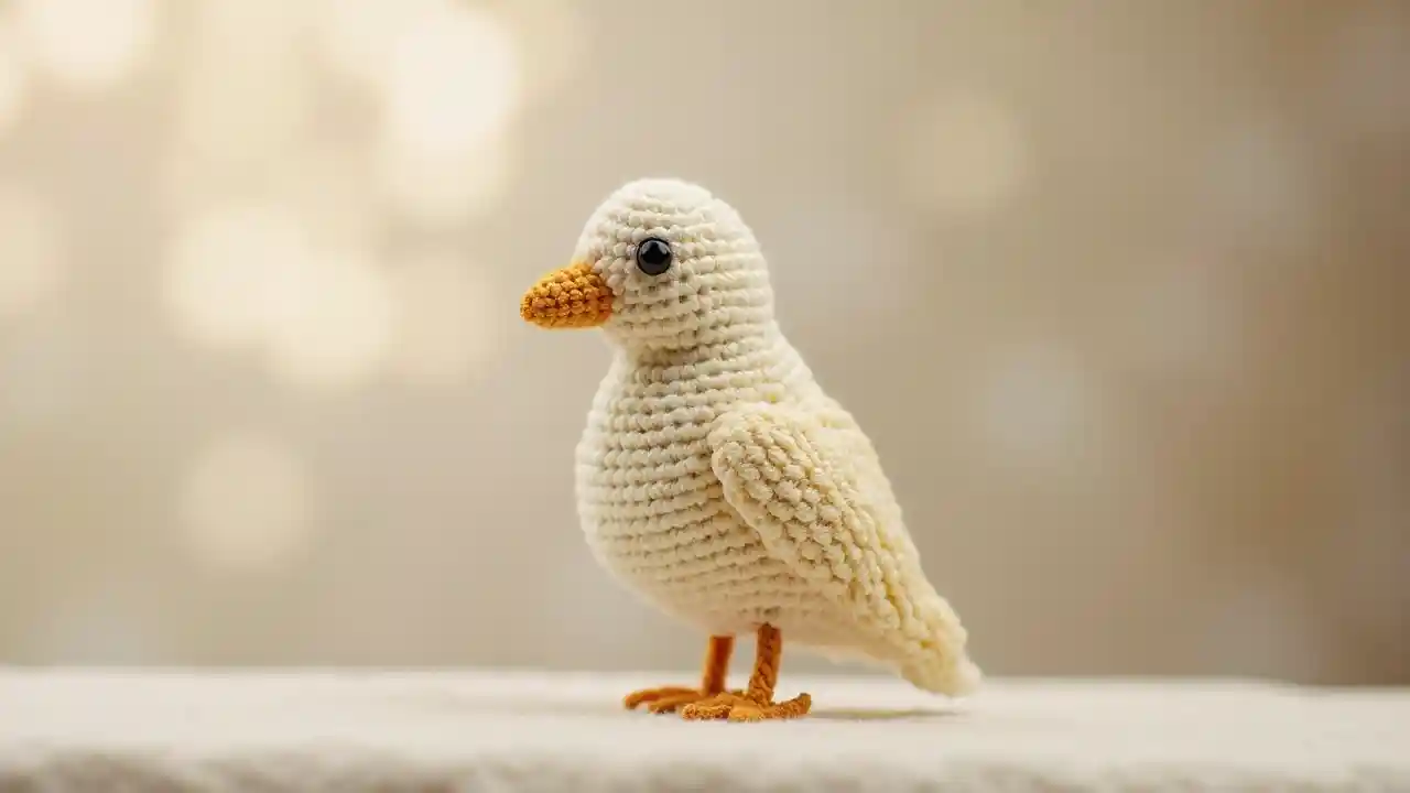 かぎ針編みのあみぐるみ鳥,スタジオ写真,白とベージュの色合い,ボケ