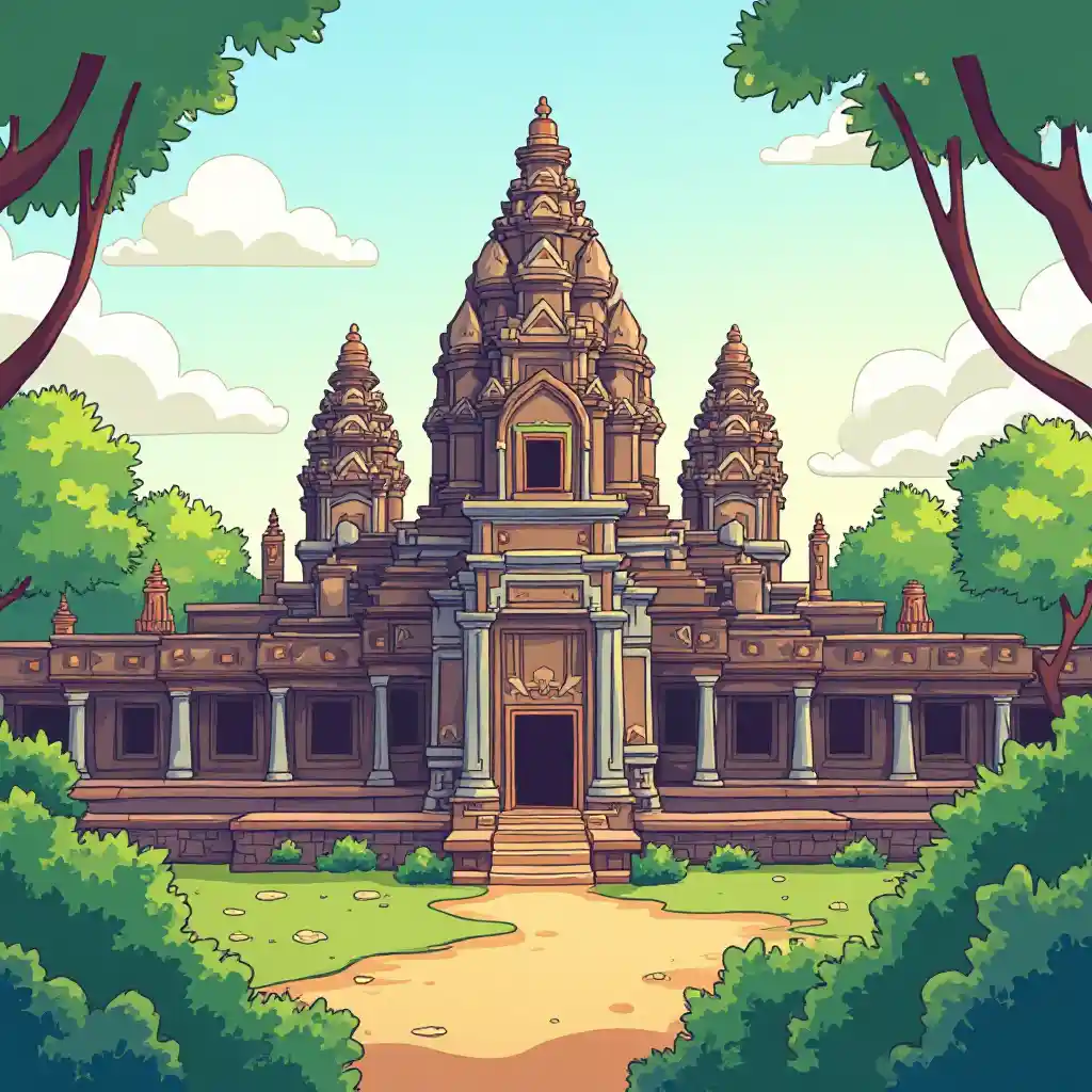 カラフルなアンコールワットのイラスト、子供に優しいシンプルなデザイン、陽気な雰囲気、大胆なアクセント、教育的で魅力的なスタイル、鮮やかな色、漫画のようなディテール、緑豊かな周囲のジャングル、遊び心のある雲、2 Dアート、魅力的で暖かい雰囲気、幼稚園生のための高品質の視覚効果、魅力的な人物、壮大な寺院の風景描写。.