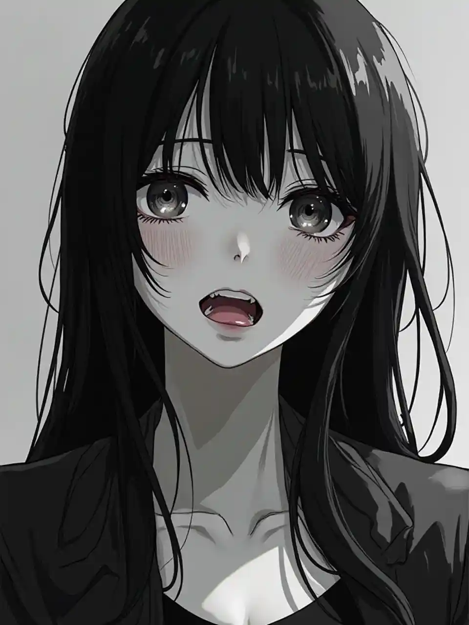 ポートレートカメラの視点から撮影されたクローズアップモノクロのデジタルイラストは、印象的な顔立ちと流れるような長い黒髪を持つ若い女性のクローズアップポートレートを物語っています。質感とディテールに焦点を当てたモノクロスタイルで撮影されています。. 画像はまた、女性の顔と髪の質感を強調する劇的な光を示しています。. 画像の真ん中に、20代前半に見える女性がいます。彼女の顔は観客に向けられており、彼女の目は観客に向けられています。. 彼女は細身で長い黒髪を後ろから垂らしていたが、 唇と離れてピンク色の舌を出している。. 彼女の表情は強烈な感情で、ほおに赤みが走っていた。. 彼女は黒と白の衣装を着ており、背景は濃いグレーから白へのシンプルなグラデーションで、印象的な顔立ちとは対照的です。. 日本のアニメや漫画の芸術を連想させる作風で、緻密なディテールと光沢のある仕上げが全体的なリアルさを増している。.