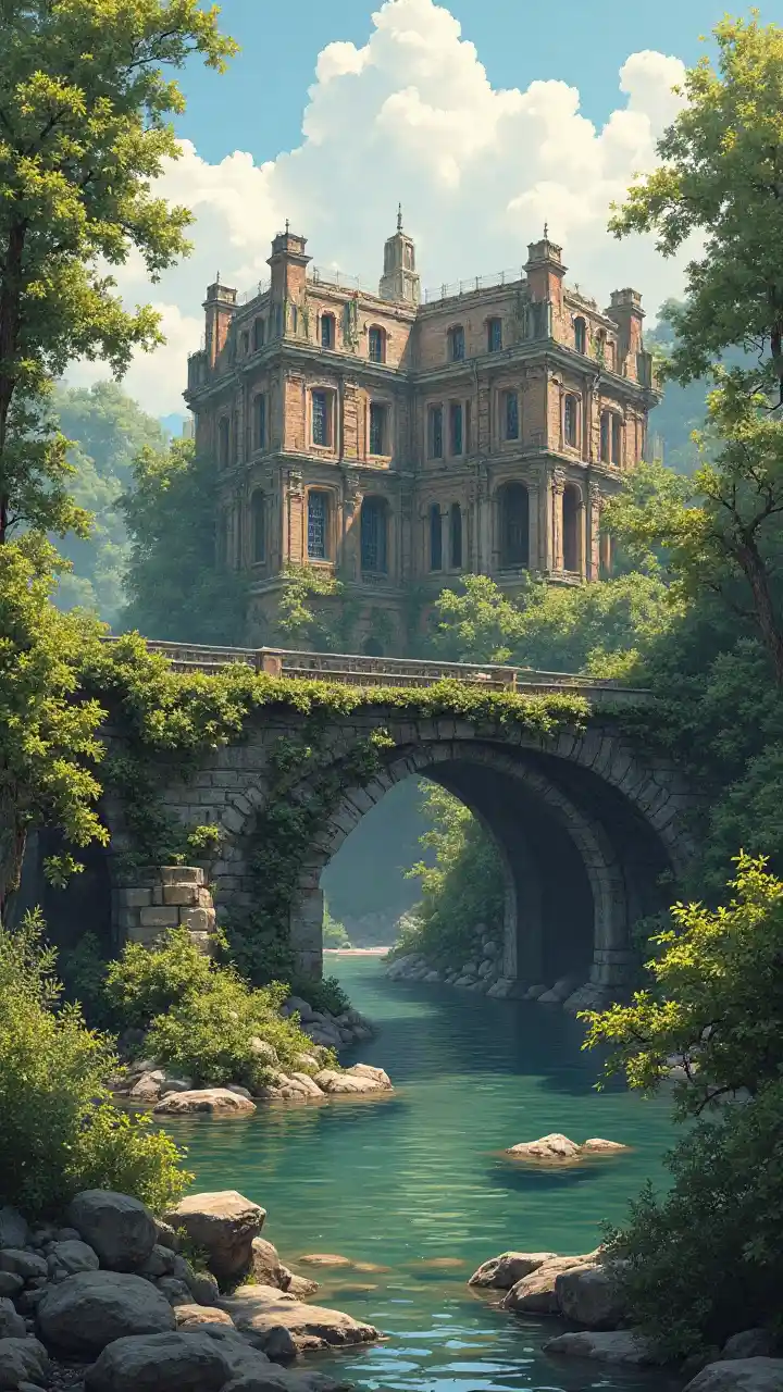 ランバートヴィルの廃墟としてのこの橋を描いた代表的な作品は、植物で覆われ、部分的には終末期の中世社会によって再建され、落葉樹の柱を前にしたアメリカ植民地時代のスタイルの大きな建物につながった、映画のような、真夏の光、非常に詳細
