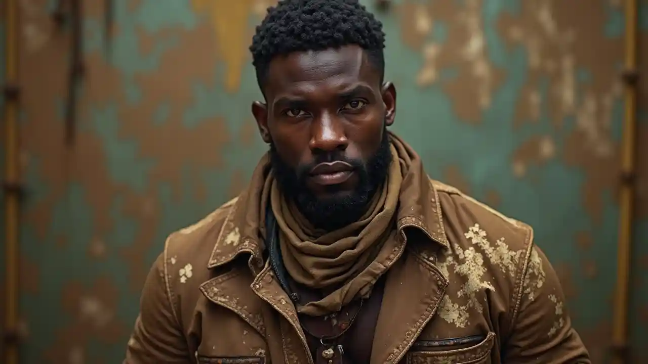 風化した、ぼろぼろの生地、広角の視点、筋肉質でハンサムな黒人、複雑な細部の背景、生き生きとした外観、繊細で表現力豊かな顔、自然で素朴な色調、リアルな画質、8 k解像度、シャープでダイナミックな照明、Tumblrなどのソーシャルメディアプラットフォームで人気があります。 Artgerm、Greg Rutkowski、Alphonse Mucha、Loish、WLOPのスタイルにインスパイアされた微妙なクリエイティブな調整は、キャラクターに神秘性と深みを与えます。.