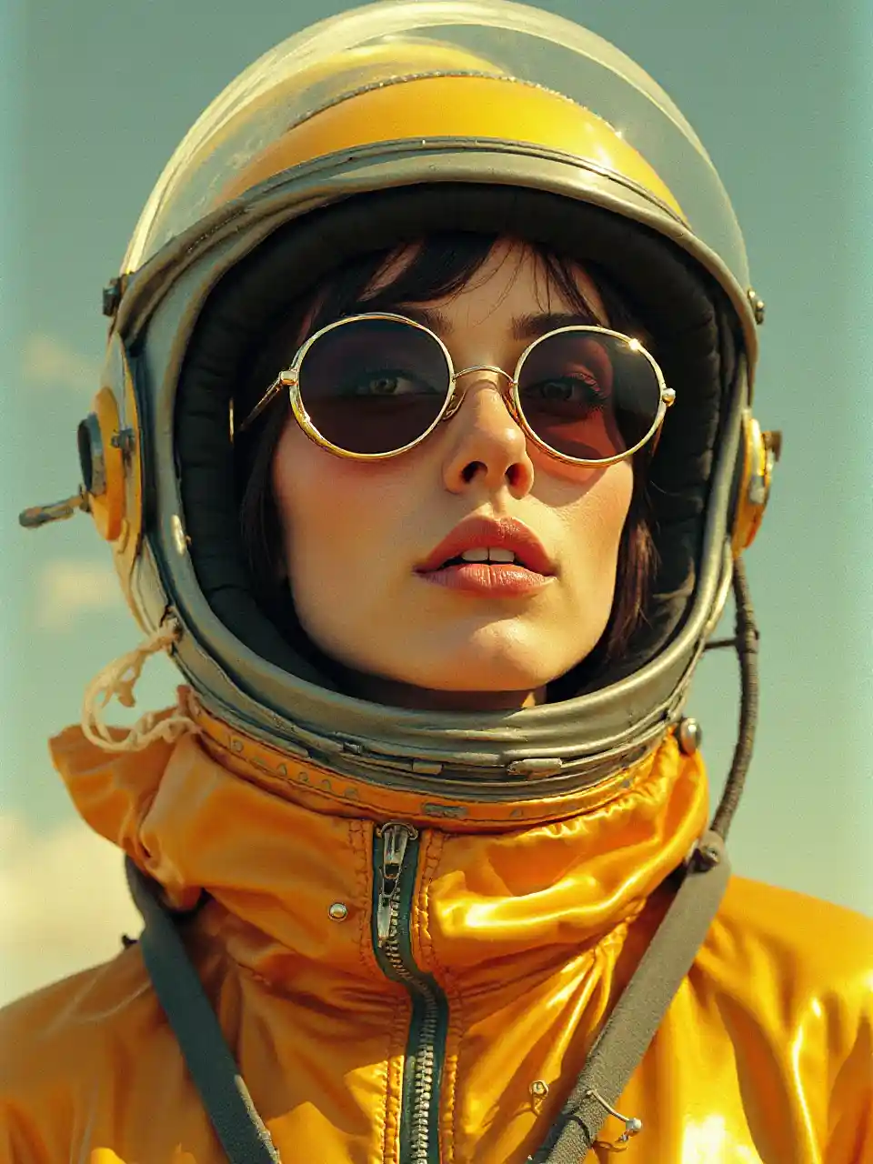 1960年代の黄金の宇宙服の芸術に身を包んだ宇宙飛行士の女性