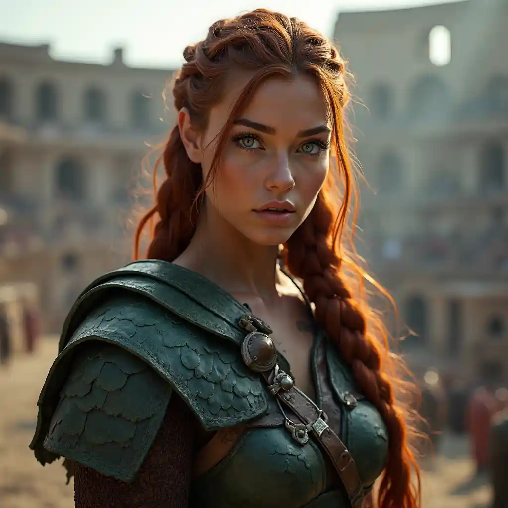 美しい、ケルト人は人間の女性野蛮人にインスピレーションを与えました。. 彼女は長い赤いバイキングスタイルの三つ編みの髪、鋭い青い目、浅黒い肌を持っています。. 彼女は濃い緑の鱗の重い鎧を着ていた。. 彼女は剣闘士のコロシアムに立っていた。.