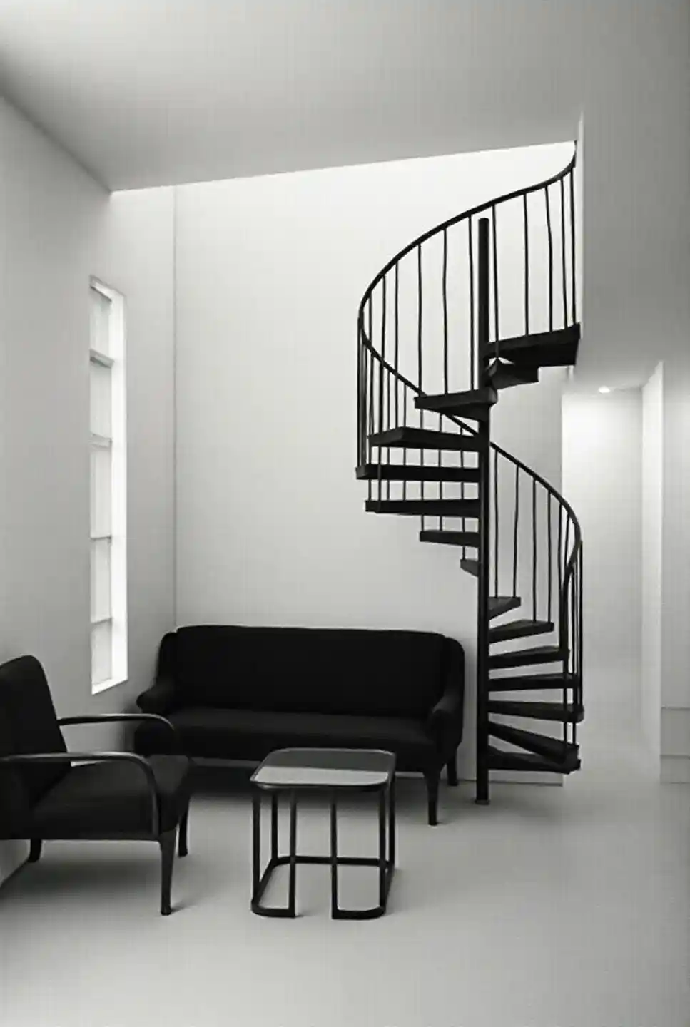 白黒写真,部屋のインテリア, 1920年代ドイツ,バウハウス,機能美,白を基調とした部屋,黒いソファ,ガラスのテーブル, BAの螺旋階段