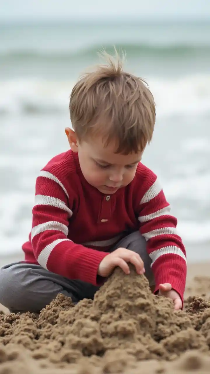 赤と白のストライプのセーターを着た小さな男の子が砂浜に座って砂の城を建てているのを想像してみてください。. 波は彼の後ろの岸に軽く打ち寄せられ、彼は砂地を形作りながら非常に集中し、静かで穏やかな瞬間を作り出しました。.