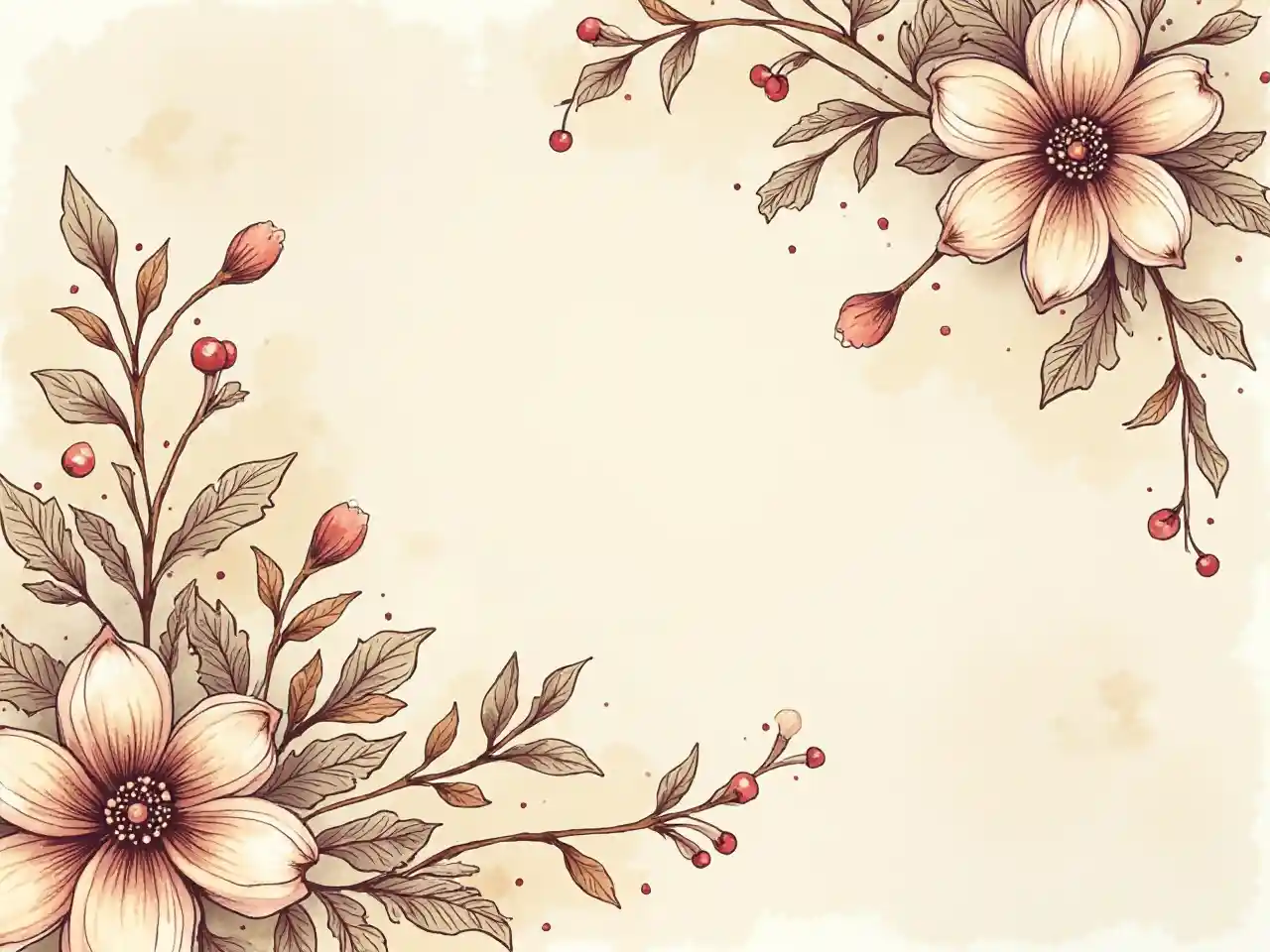 2トーンのベージュのインクデザイン、ベリーと葉を背景にしたクリスマスの華やかな花