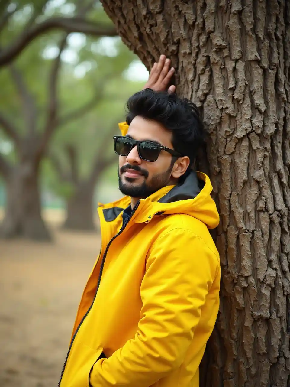 黄色のジャケットを着た男が木にもたれかかり、手を木の幹に上げ、サングラスをかけています, Bikash Bhattacharjee, samikshavad, jayison devadas,写真素材
