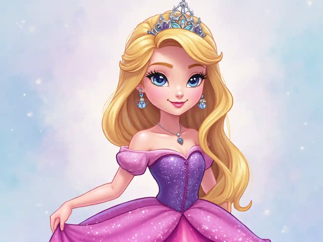 ピンク、紫、青のきらびやかなドレスを着た金髪の王女のデジタルイラスト。.
