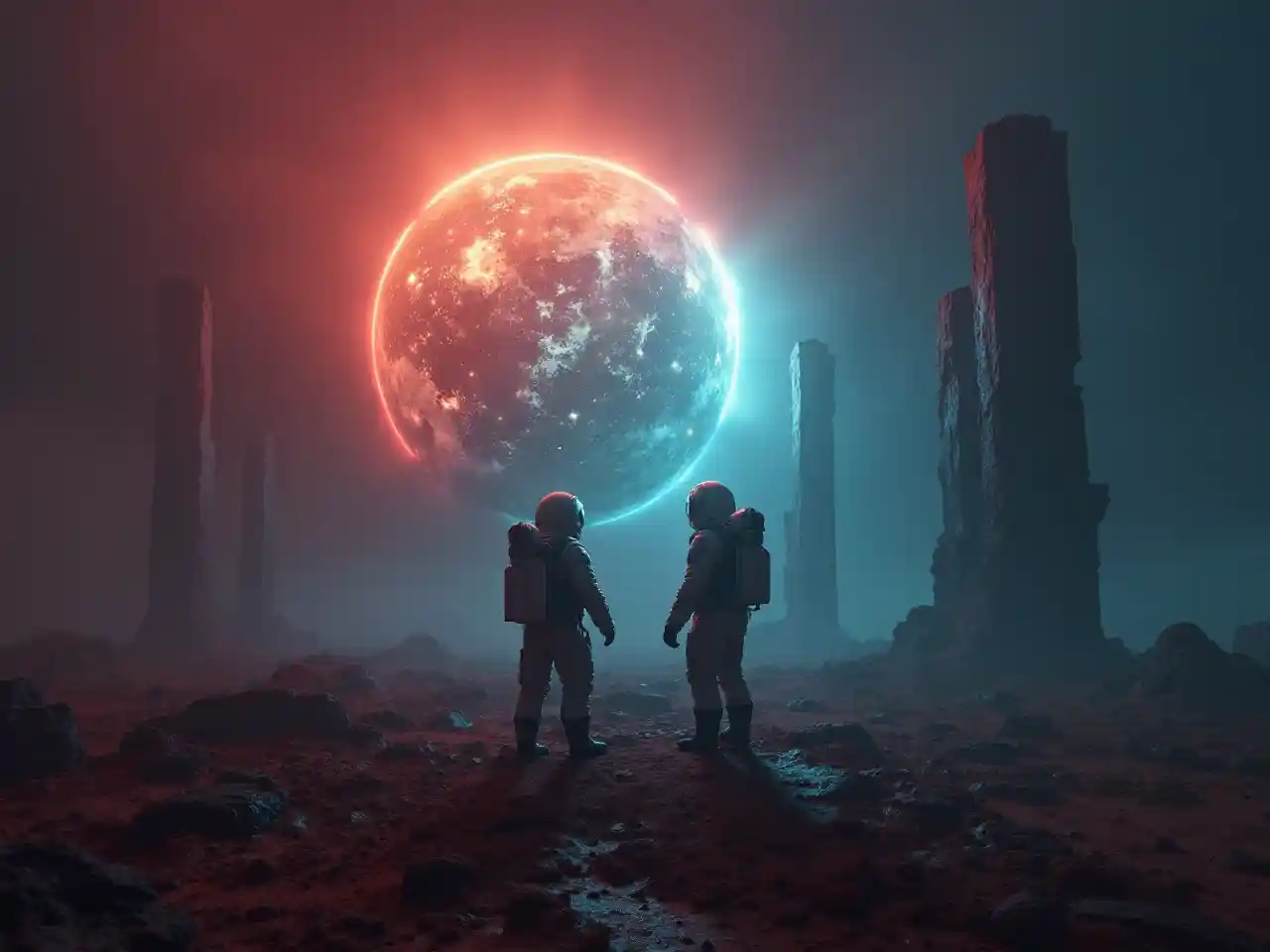 2人の宇宙飛行士は、海を伴った血みどろの火星で、地球を腕に抱えていました。創造の柱があり、暗く、霧があり、ムーディーで、映画のようでした。. 明るい光、ネオンがあった。. 色の爆発の背後に