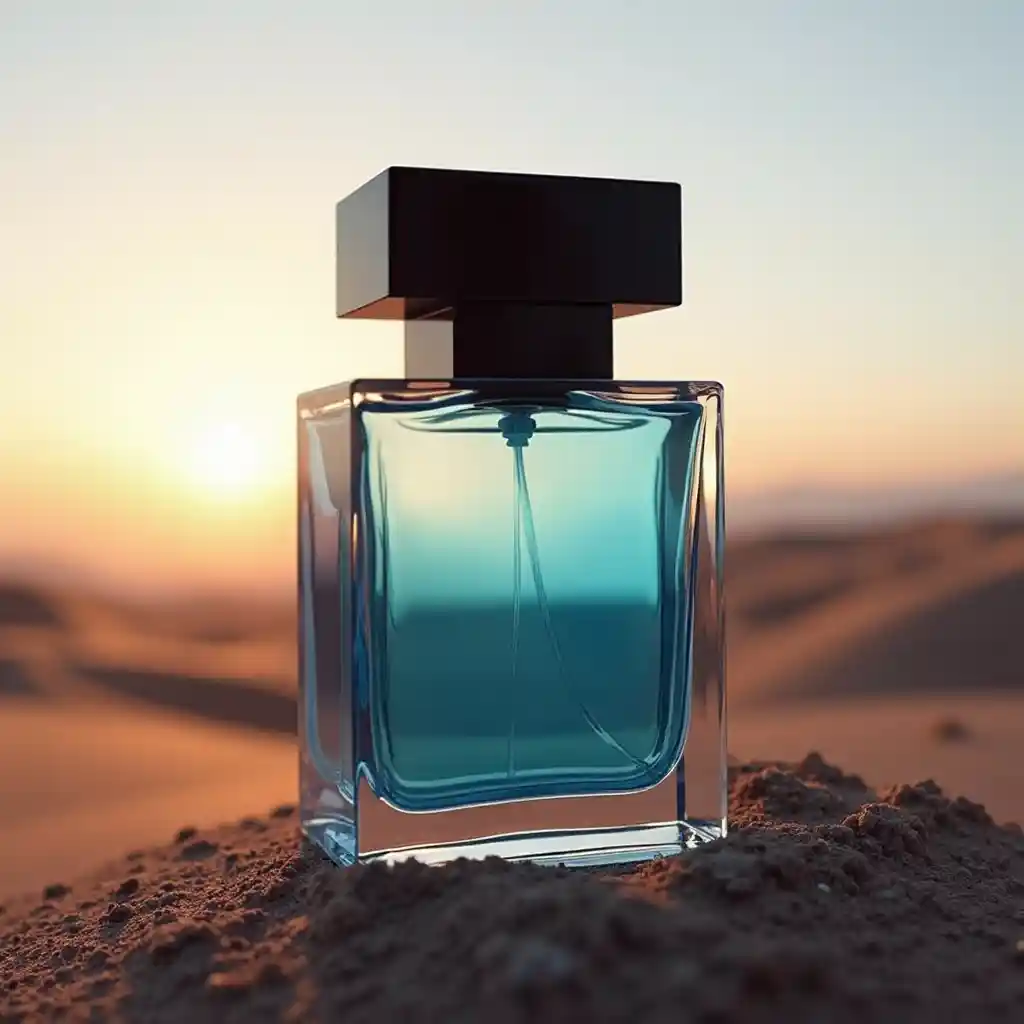 Luna豪華な香水ボトル、100 ml、正方形、モダン、ミニマリストのデザイン。. 透明なガラス。. 液体の中は青みがかった色合いをしている。. それは大きな、黒い四角い蓋を持っています。. それは砂漠の地面に座っていて、太陽は遠くから昇っています。.