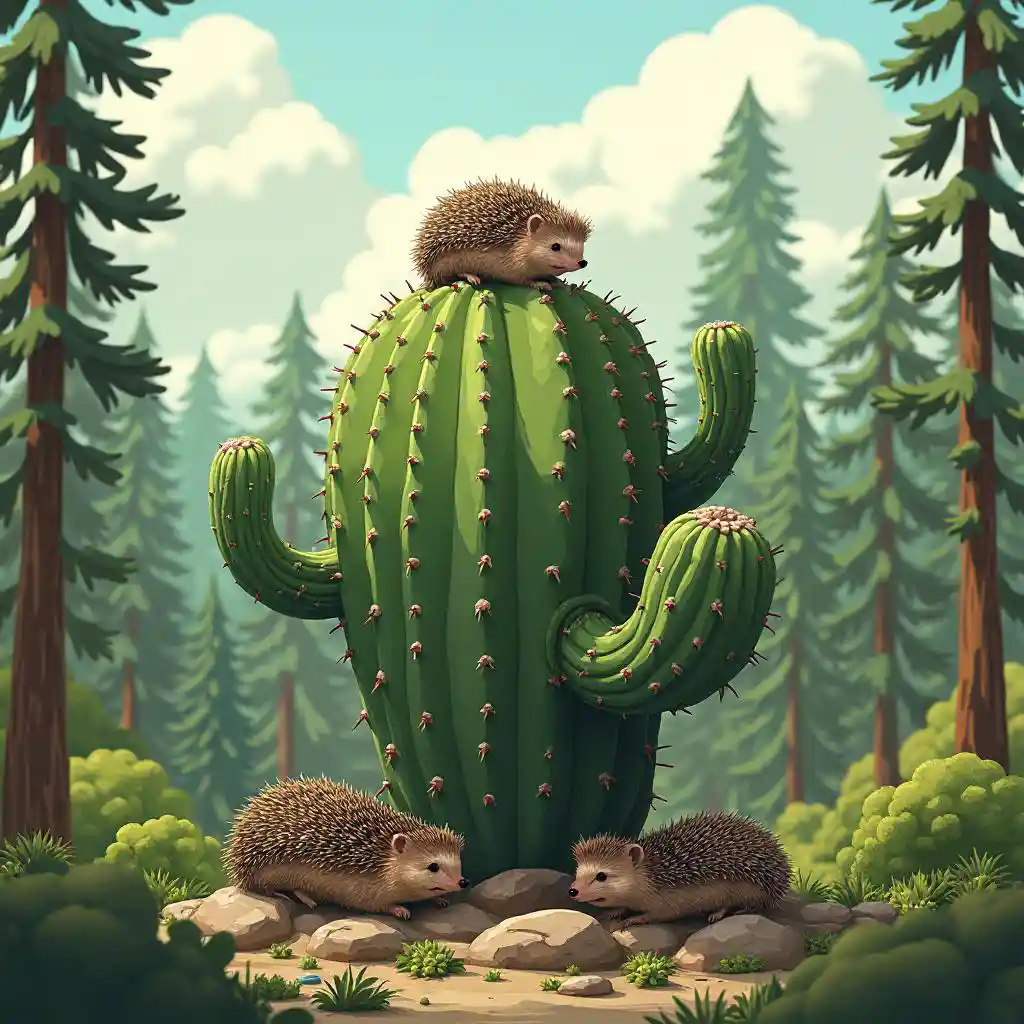 シュールな写真:森の大きなサボテン、その上に登るハリネズミ、山を登る人のように、漫画のように、面白い。.