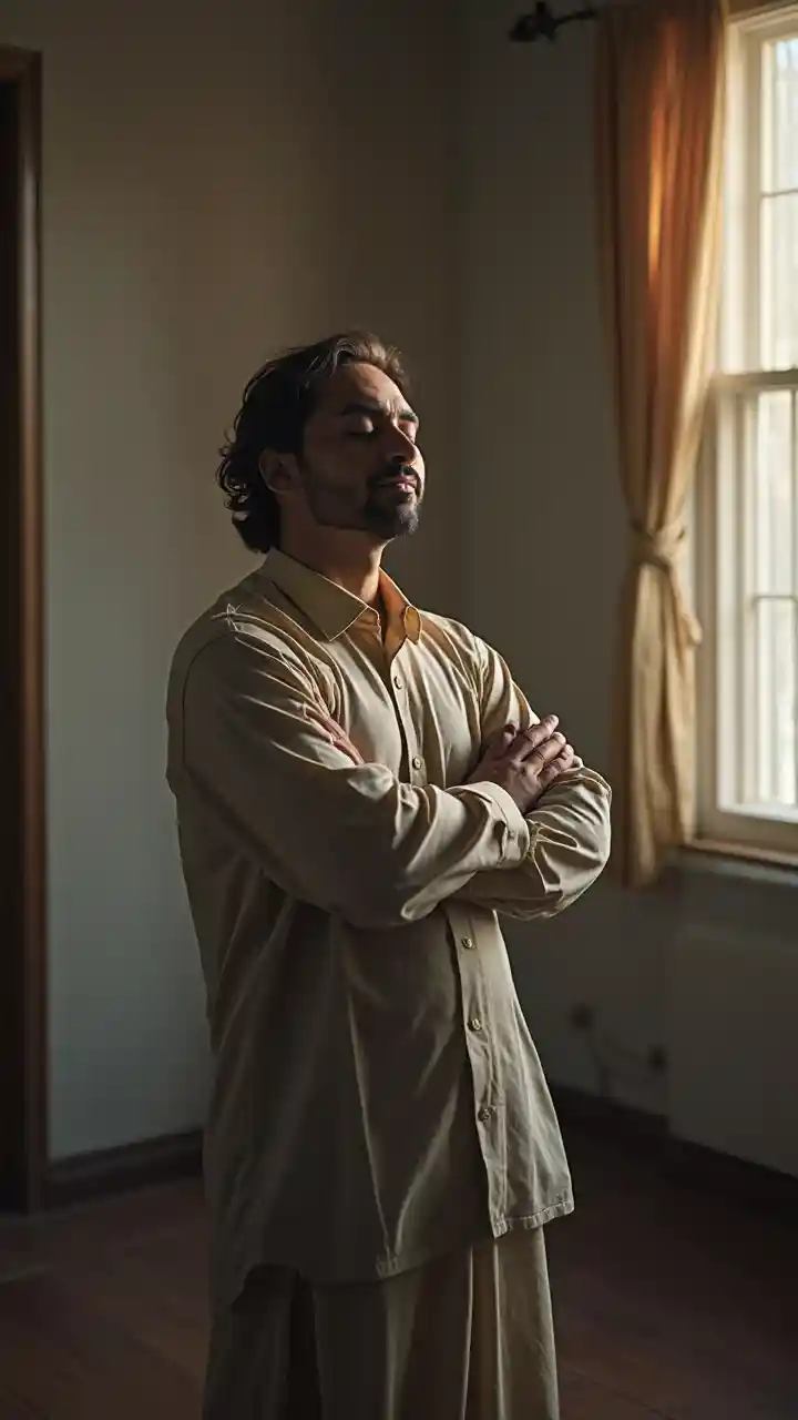 Joanna飾られていない部屋に、腕を組んで目を閉じて立っている男のリアルな姿は、思慮深い表情を見せている。. 落ち着いた雰囲気を強調し、柔らかな自然光が窓越しに優しい影を落とします。. 背景は繊細な質感が特徴で、深みと専門性を高めています。. Samikshavadの特徴を捉えた内省的なエッセンス。. Bikash Bhattacharjeeのスタイルを彷彿とさせる、高品質で超緻密な、落ち着いたスタイル。.
