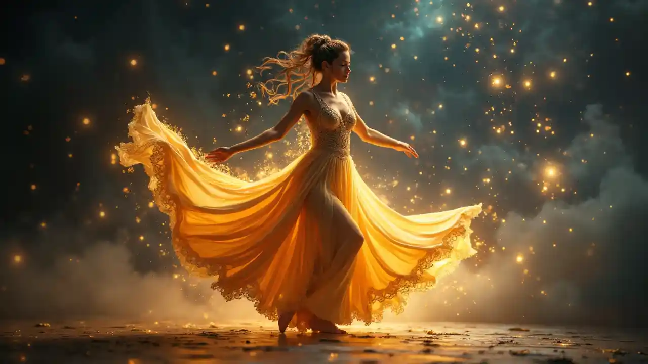 星の間の夢のダンサー集。. 彼女は優雅に宇宙を飛び越える。. 彼女が移動するにつれて、彼女の道徳的な金色のローブが優しく流れました。. 彼女の美しさは神聖でかつだらしない
