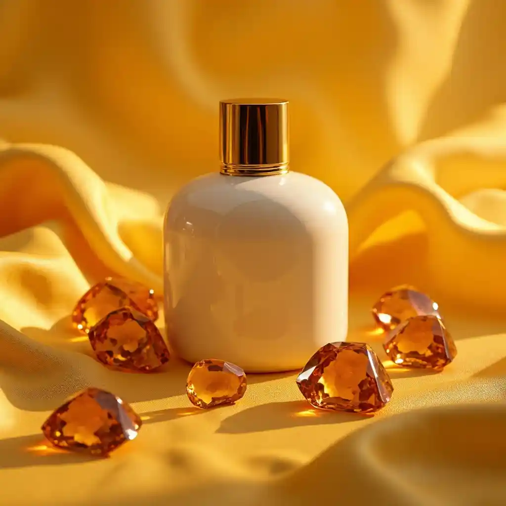 プロの写真撮影、映画撮影のための豪華なセラミックフレグランスボトル、琥珀の宝石に囲まれた、黄色のサテンのスカーフの背景、ラベルなし、クリア、プロトタイプ