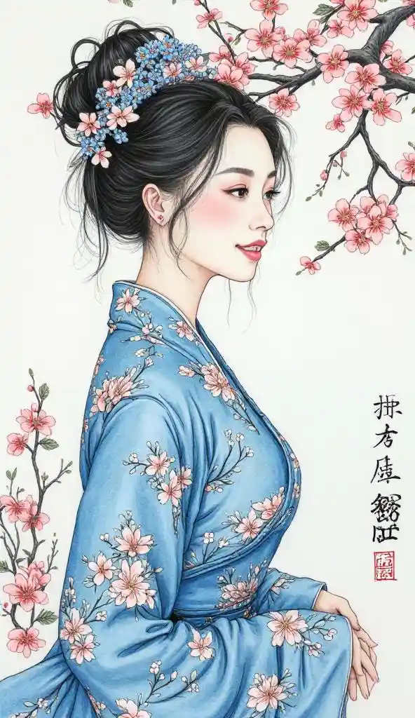 (チャイナドレスを着た青い桜の花の女性: 1. 5 )、細部のイラスト、息をのむような美しさ、細部の線画、超品質、埋没