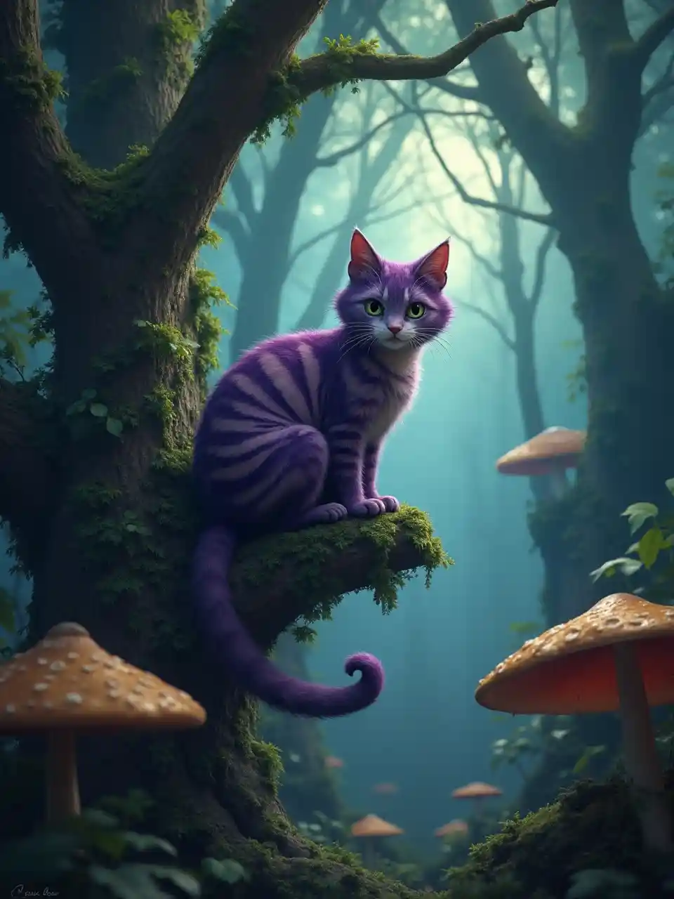 木と大きなキノコに囲まれた、密集した神秘的な森の真ん中にある枝の上のチェシャ猫。. 非常に幻想的で魅惑的な雰囲気、ドラマチックな照明と高度なディテール。.