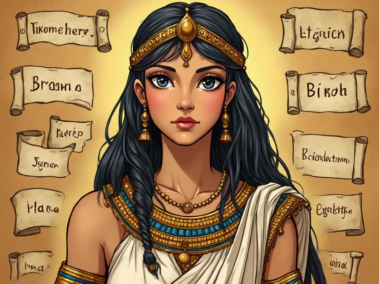 有名なエジプトの女王クレオパトラのイメージを形作り、その要素は彼女のギリシャの伝統と多くの言語を話す能力を強調しています。. さまざまな言語の巻物や碑文を身に着けた王家の衣装を身に着けさせましょう。.