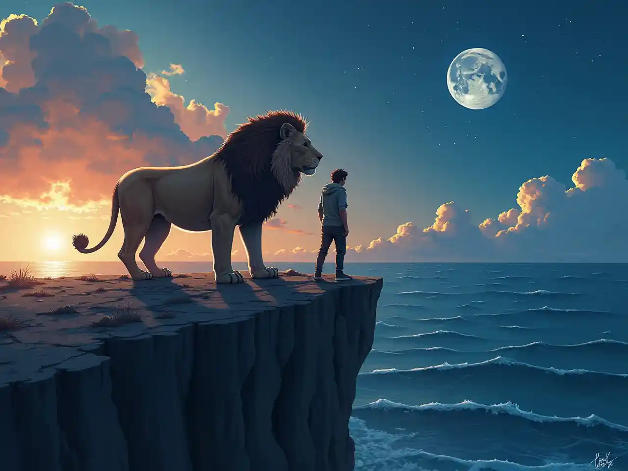 27歳の男性の隣にいるライオンは、海を横切る崖の上に立っています。. 空には昼と夜が見える。. 画像は人物の背後から第三者の視点で見られます