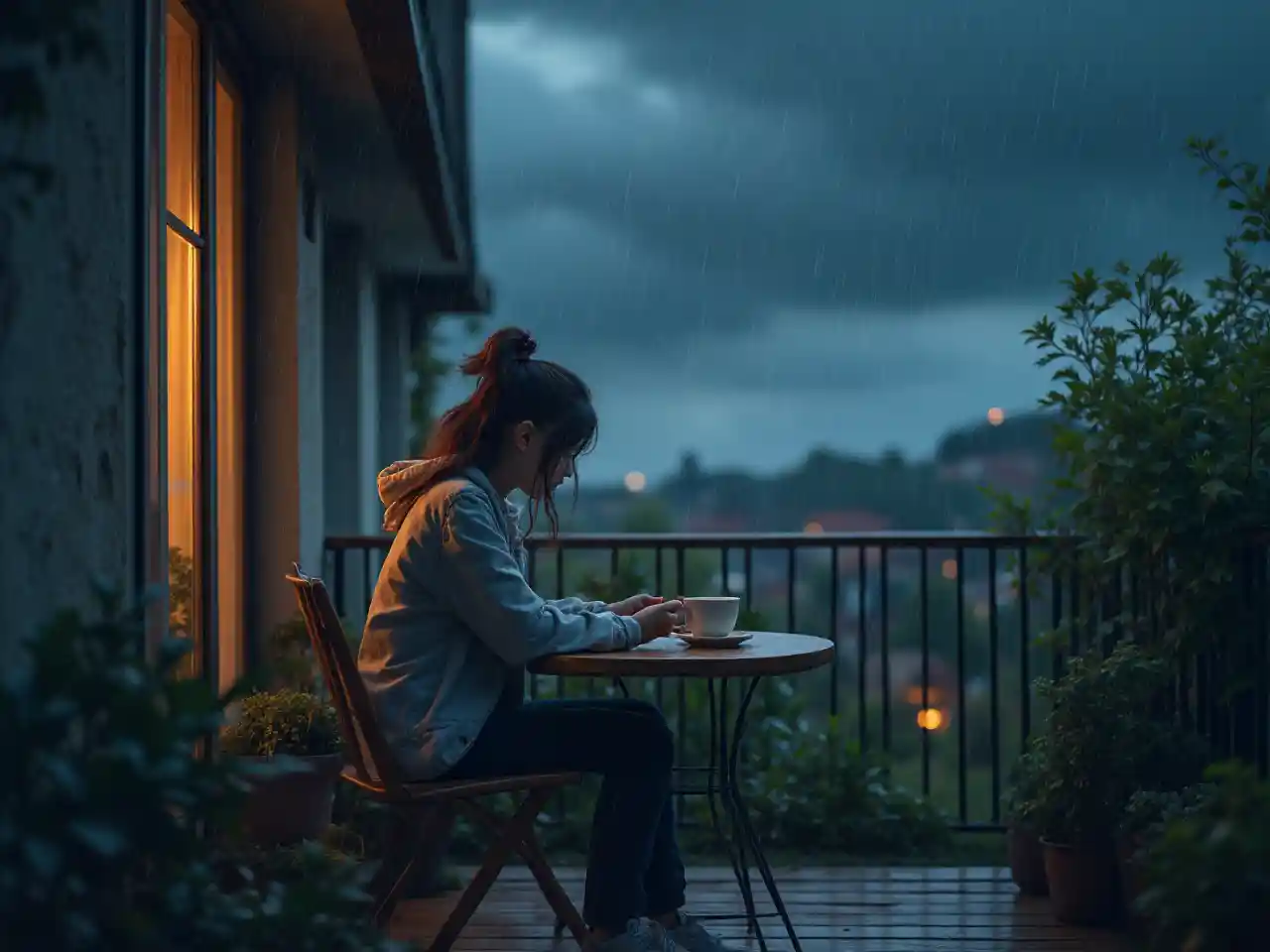 暗い雨の夜にコーヒーを飲みながら、若い女の子がアパートのテラスに座っていました。. アパートは暖かさ、快適さ、明るさを反映する必要があります。. 黒い雲が立ちこめ、荒れ狂う風が吹き荒れ、さわやかな雨の香りが世界を止めた。.