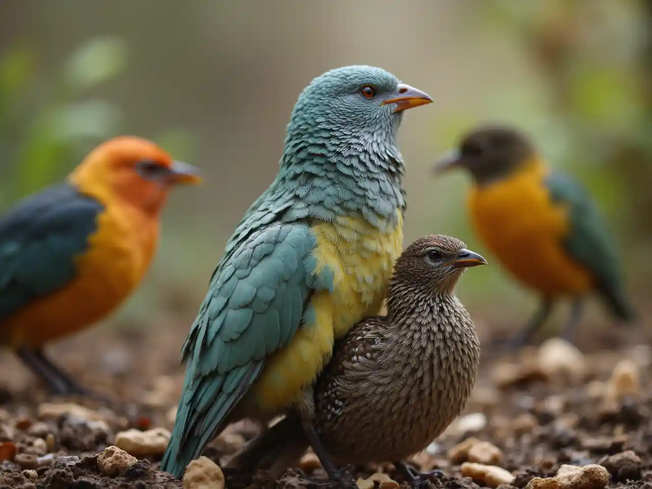 一羽以上の茶色の鳥に囲まれた美しい色の鳥。.