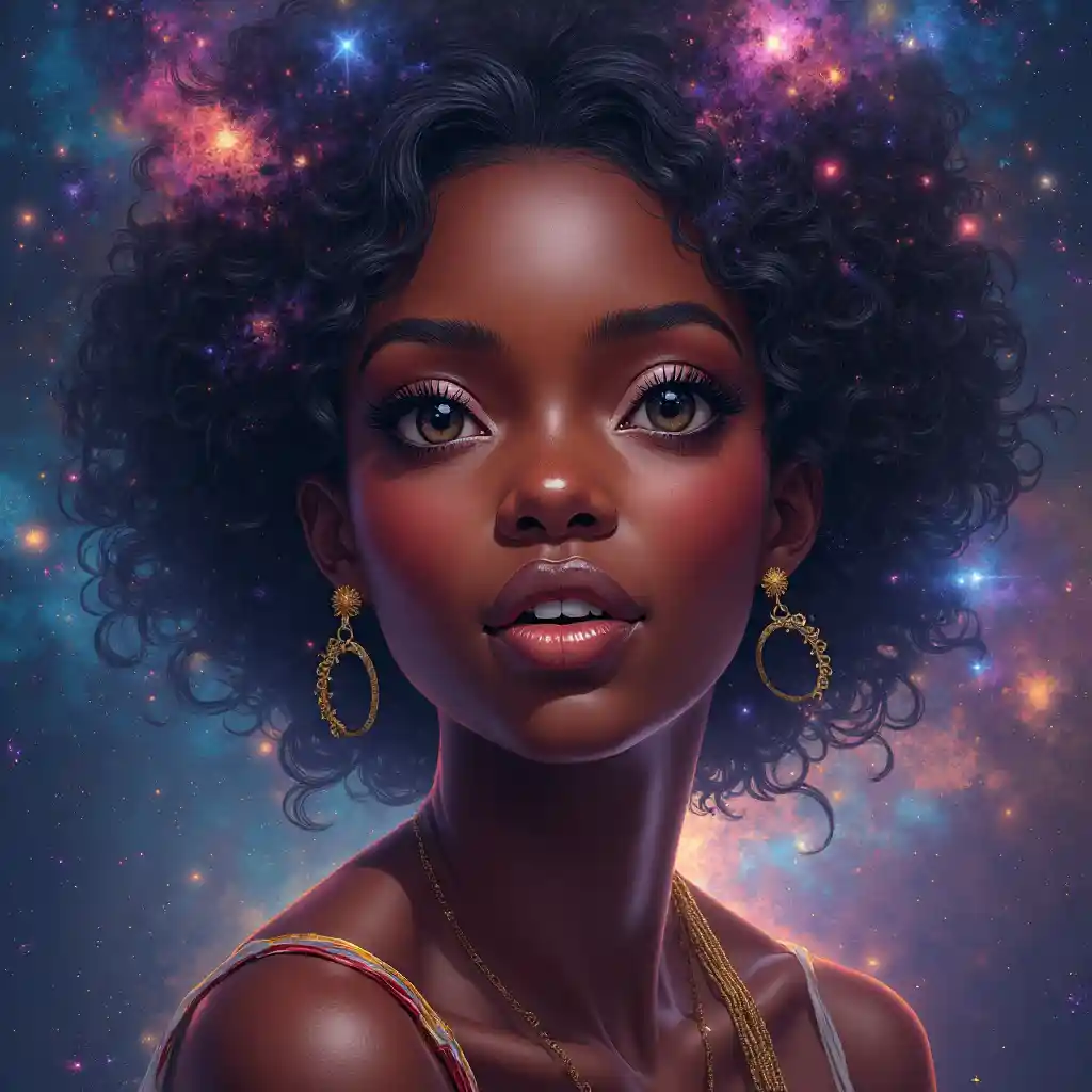 宇宙のエネルギーを放つ黒人女性が鮮やかな色彩ではじける、非常に緻密なデジタル絵画。. 彼女の顔は美しく均整がとれていて、何事もなかったかのような優しい表情と、現実的な丸い目をしていた。. 洗練されたエレガントなアートワークは、鋭い焦点とスムーズな移行を示し、幻想的で魔法のような雰囲気を呼び起こします。. Artgerm、Greg Rutkowski、Alphonse Muchaのスタイルに触発された画像は、4 kと8 kの解像度でコンセプチュアルアートの品質に優れています。. 背景設定は肖像画の魅力を高め、歪みや欠陥のない超現実的な表現を提供します。.