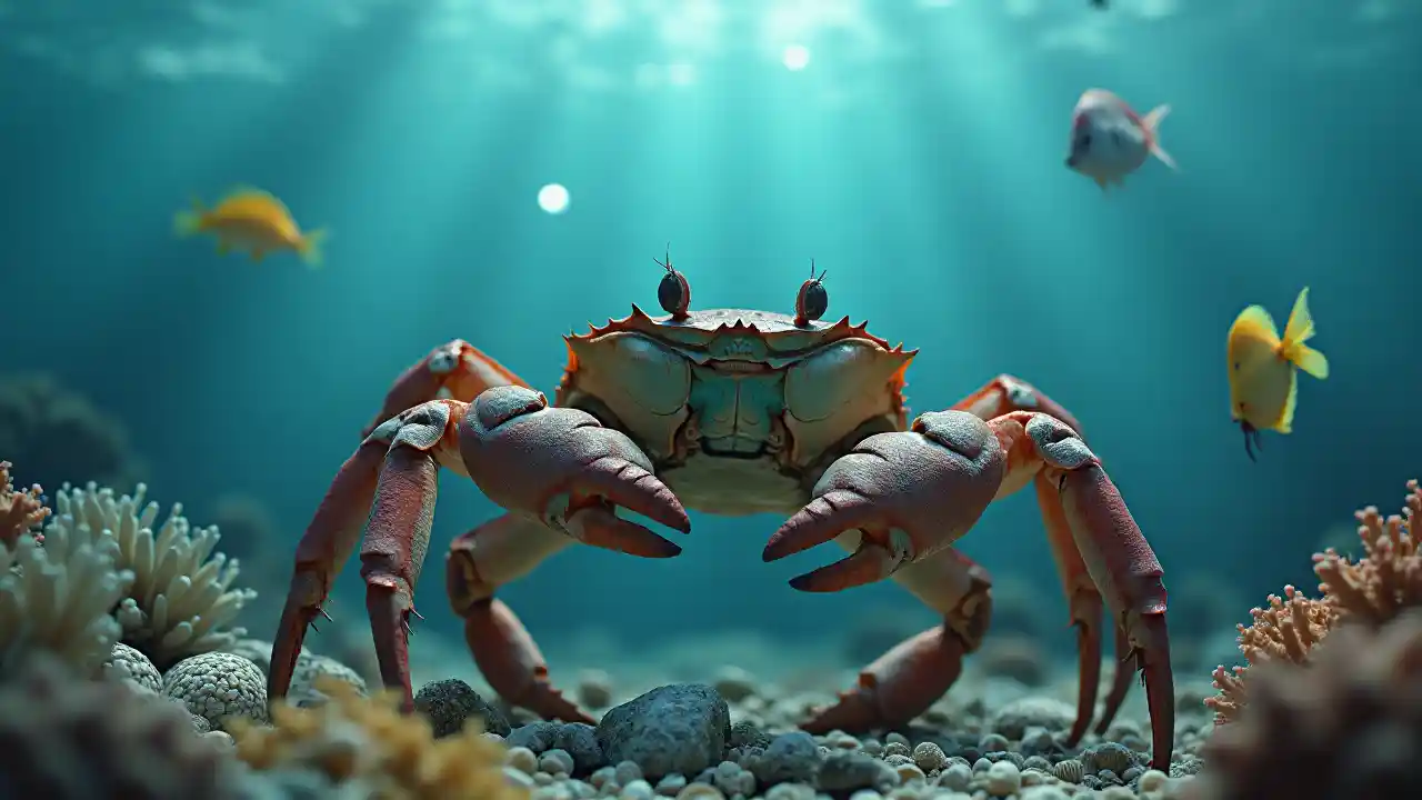 魚や海の動物に囲まれたリアルな水中カニ